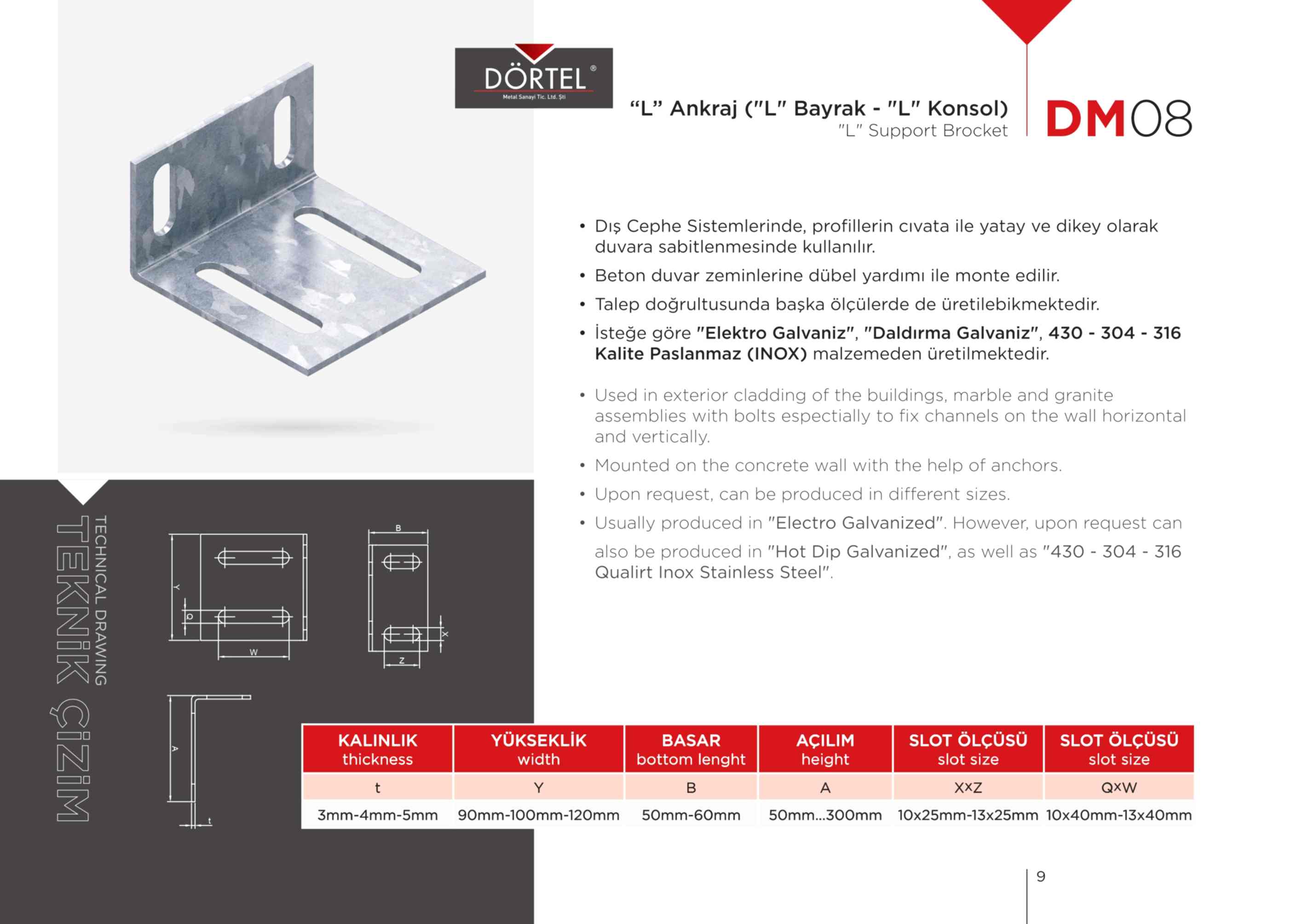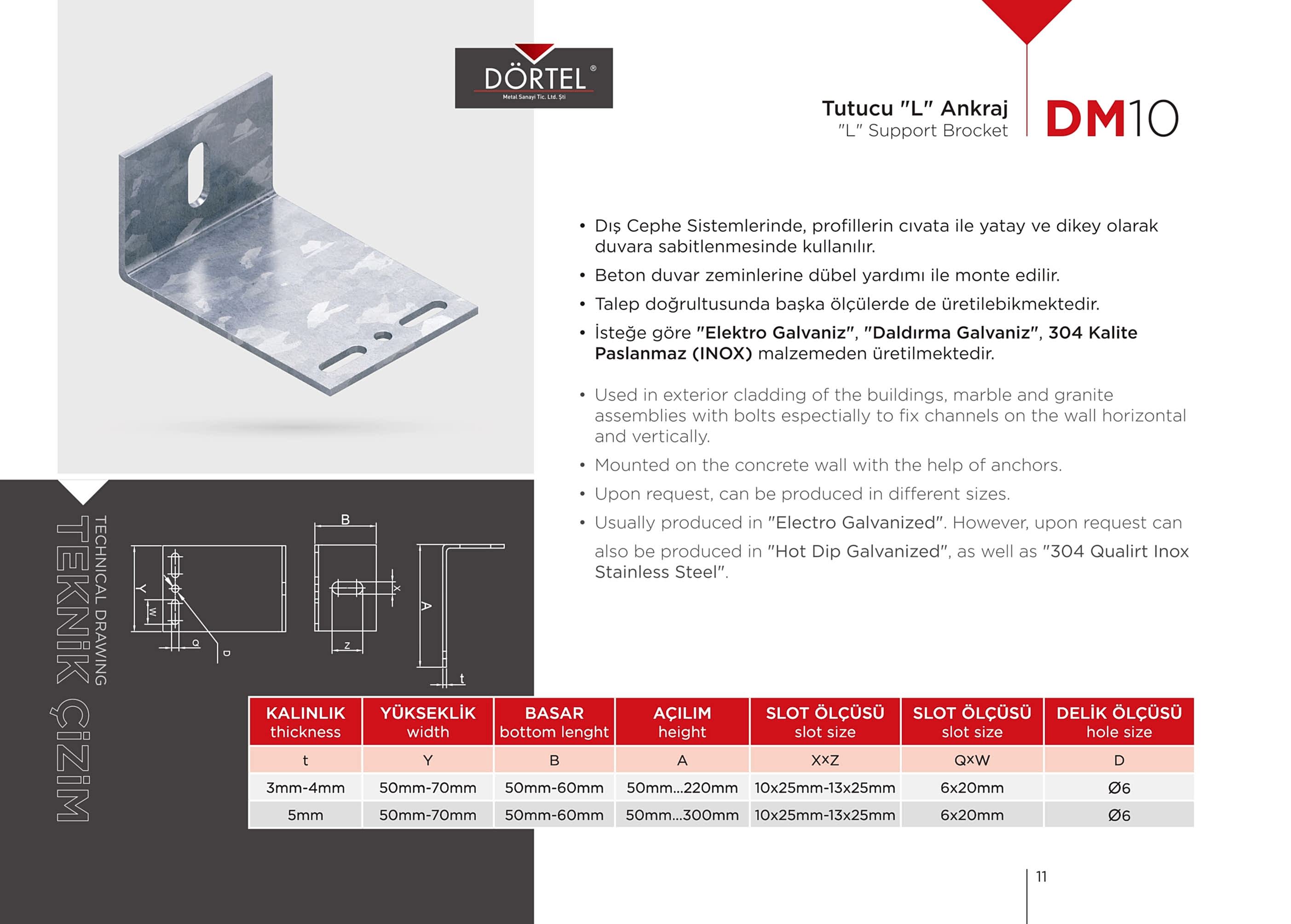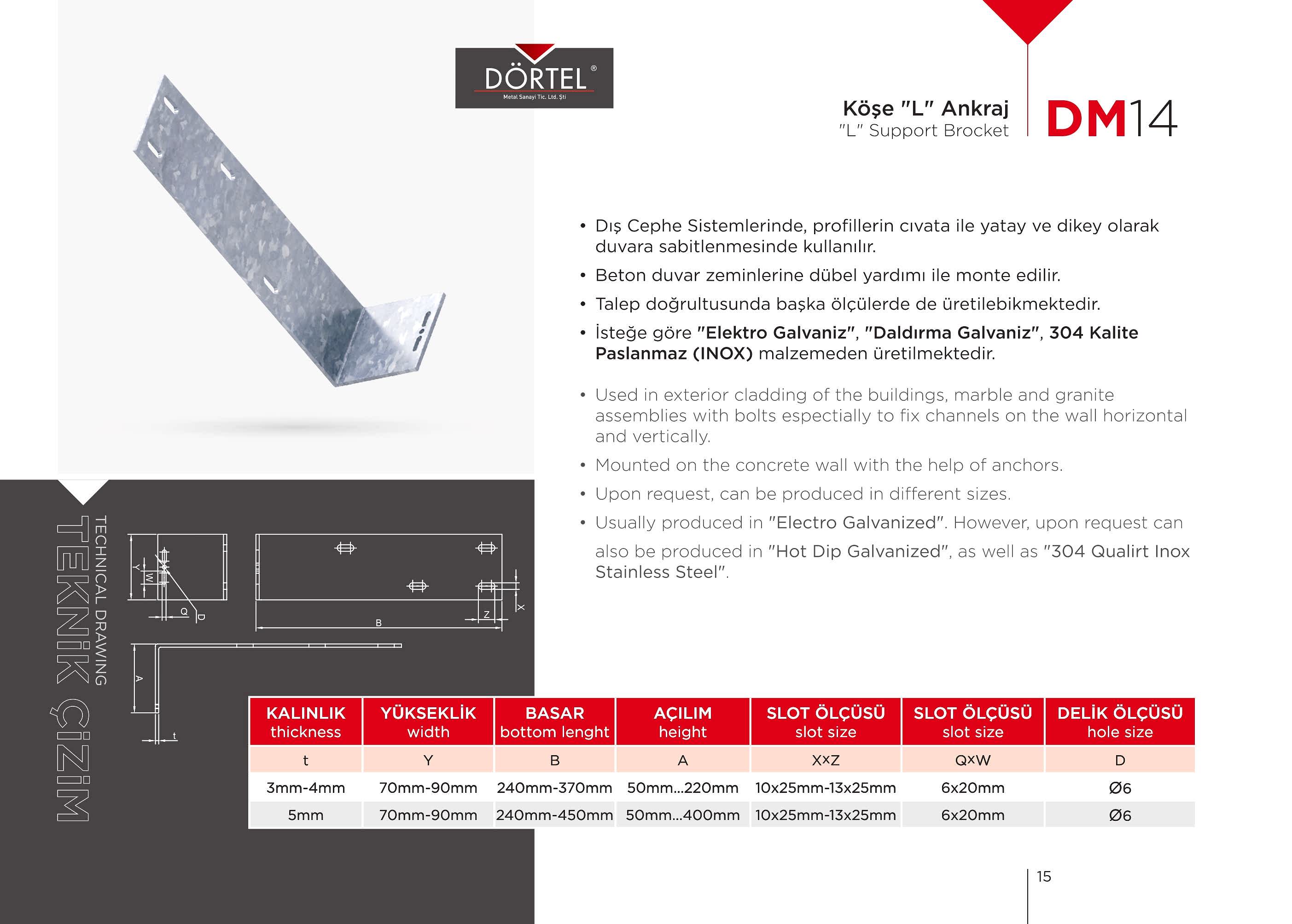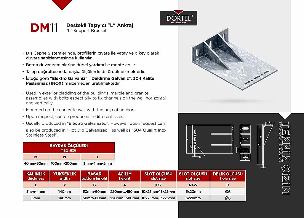TEKNİK ÖZELLİKLER Duvara dayanağı olan bir montaj elemanı olduğu için Dış cephe (mermer-granit) kaplama sistemlerinde en fazla tercih edilen bağlantı elemanıdır. İsteğe göre AISI 430K , AISI 304K, AISI 316K PASLANMAZ (INOX) malzemeden üretilmektedir. H20 GÖVDE, H40 GÖVDE, H60 GÖVDE, H80 GÖVDE, H100 GÖVDE olacak şekilde istenilen ebatlarda üretilebilir. Firmamız Dış Cephe Bağlantı Elemanları, m profil, j profil, u profil, l ankraj, özel ankrajlar, ankraj laması üreticisidir.