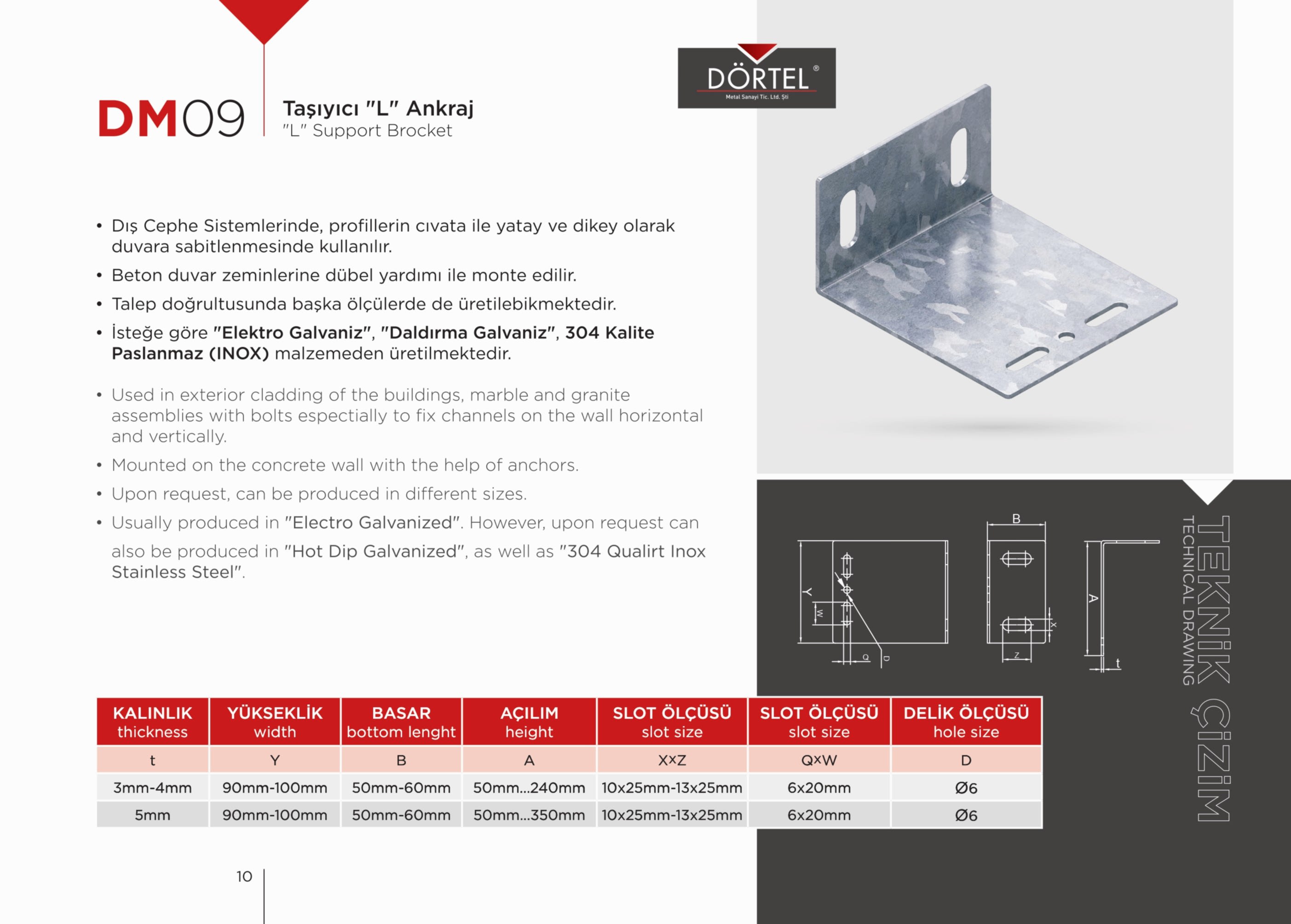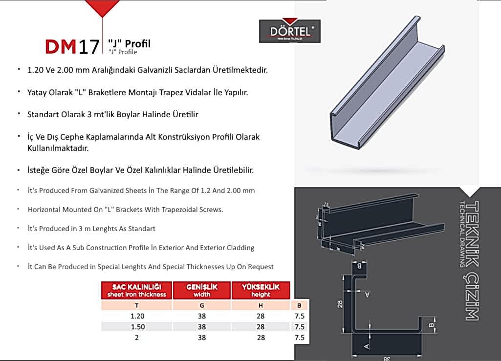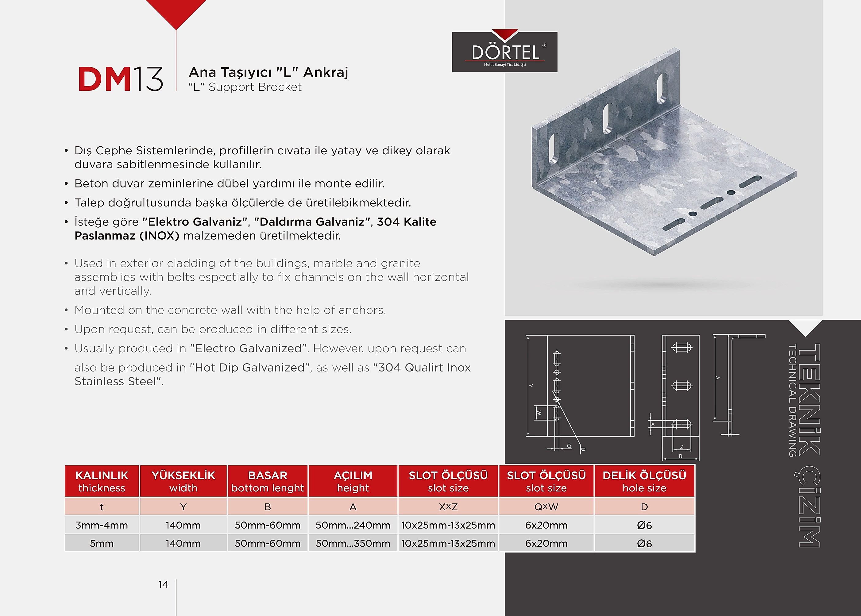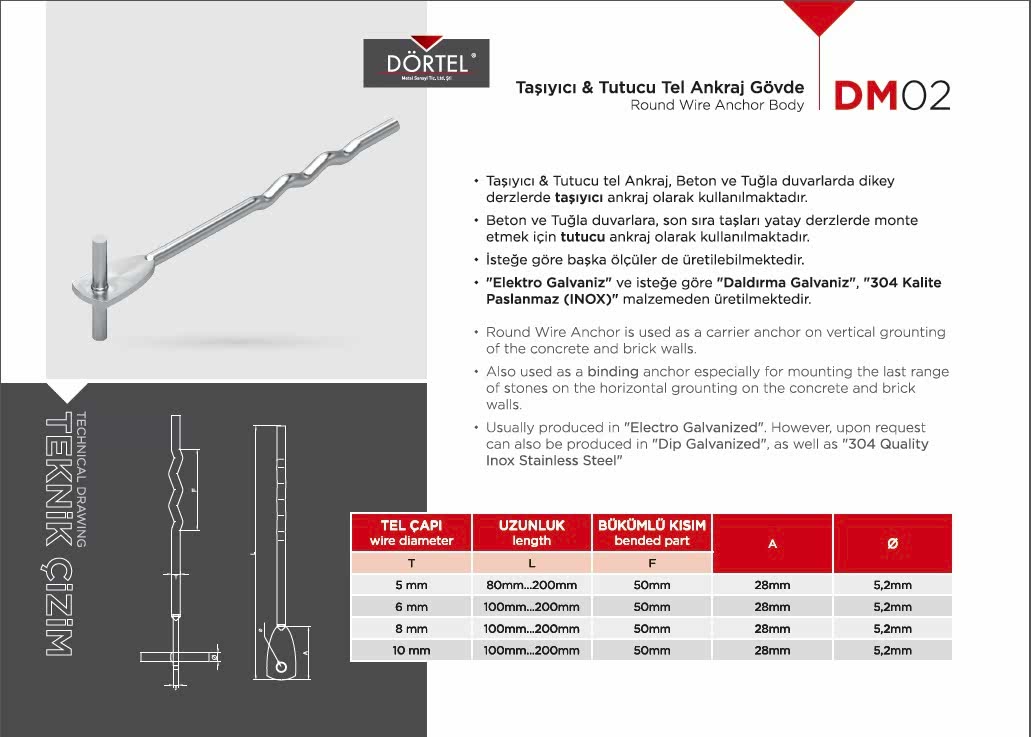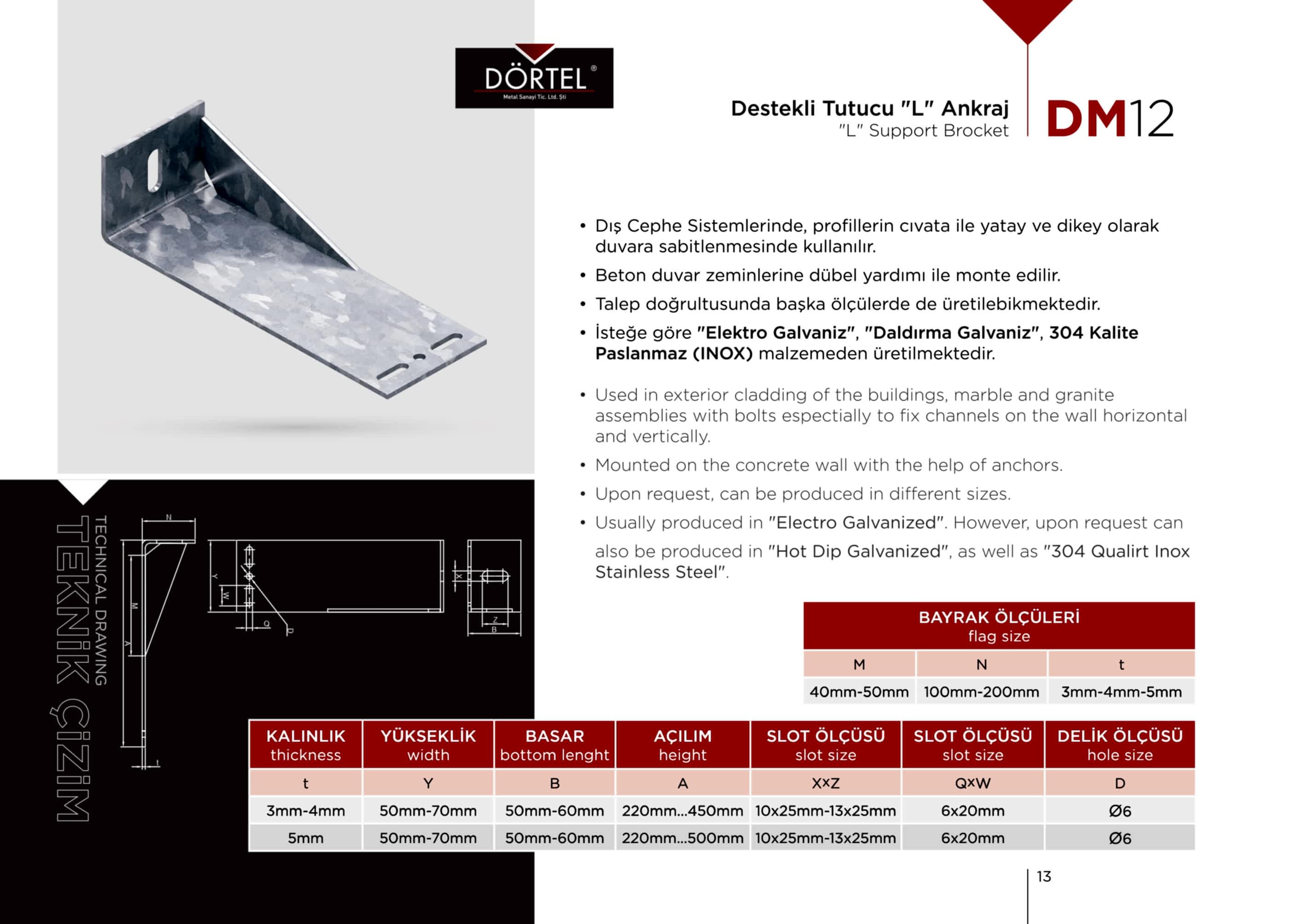 TEKNİK ÖZELLİKLER Duvara dayanağı olan bir montaj elemanı olduğu için Dış cephe (mermer-granit) kaplama sistemlerinde en fazla tercih edilen bağlantı elemanıdır. İsteğe göre AISI 430K , AISI 304K, AISI 316K PASLANMAZ (INOX) malzemeden üretilmektedir. H20 GÖVDE, H40 GÖVDE, H60 GÖVDE, H80 GÖVDE, H100 GÖVDE olacak şekilde istenilen ebatlarda üretilebilir. Firmamız Dış Cephe Bağlantı Elemanları, m profil, j profil, u profil, l ankraj, özel ankrajlar, ankraj laması üreticisidir.